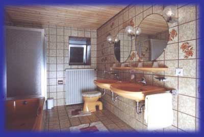 Badewanne, Dusche, Doppelwaschbecken und WC